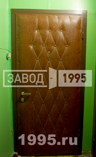 Входные двери с внутренней стороны обтянуты дутой кожей с ромбовидным рисунком. С внешней стороны в качестве декора использован геометрический рисунок на МДФ-панелях. По желанию можно выбрать другую фактуру кожи, панелей и другие рисунки.